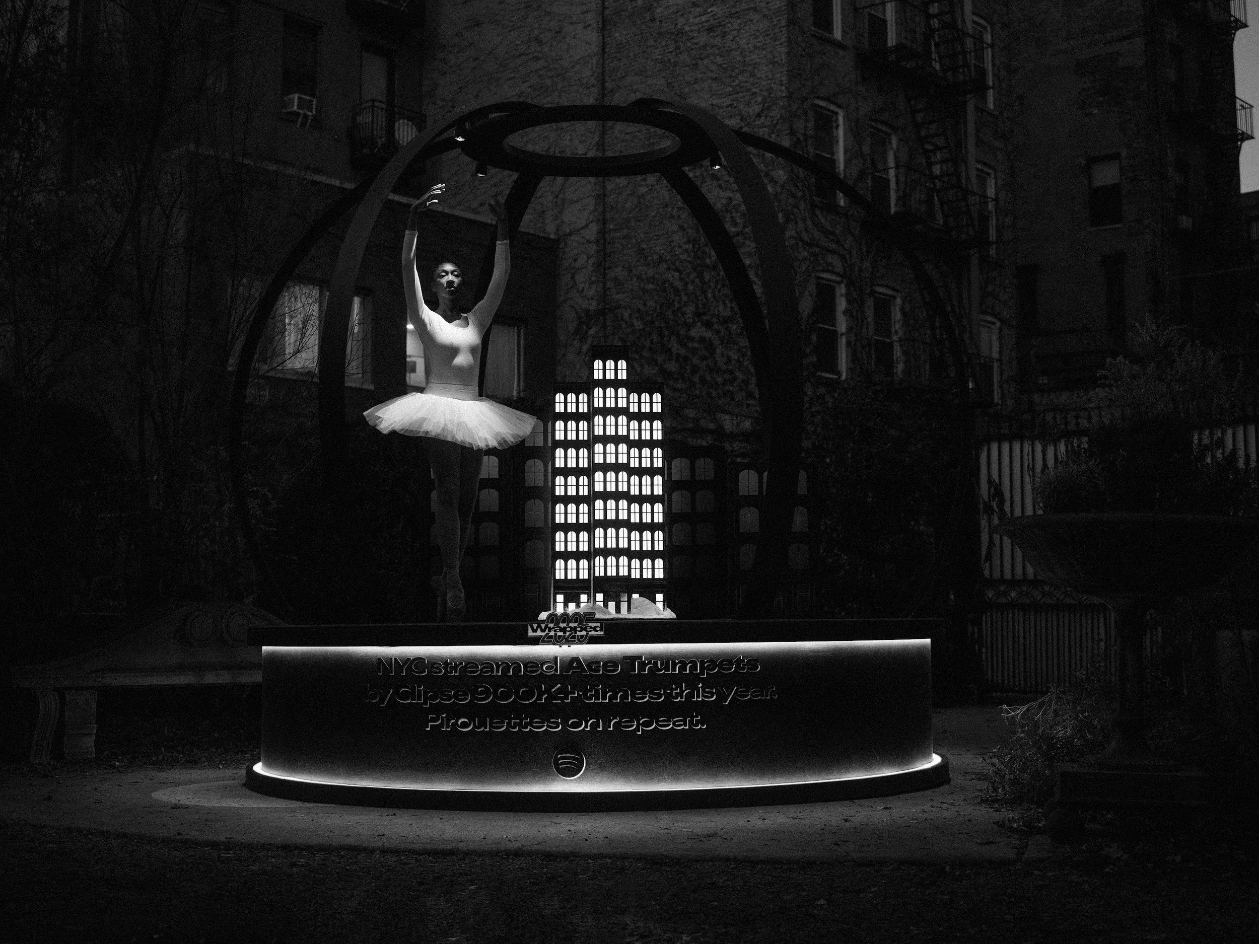 We took over Elizabeth Gardens in New York and put on a live performance with a ballerina doing pirouettes inside a snow globe, inspired by Clipse’s iconic lyric, “Ballerinas doing pirouettes inside of my snow globe.”